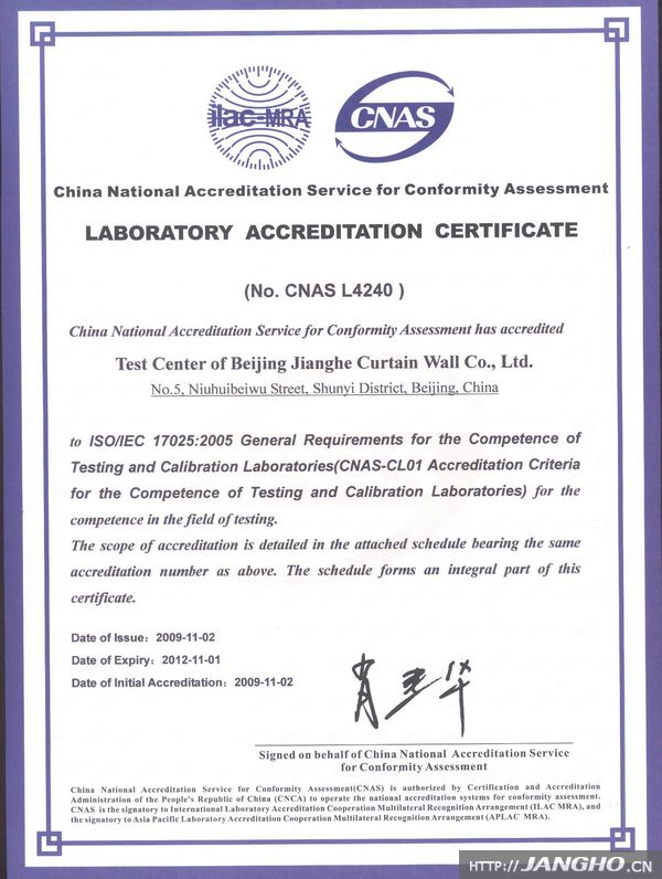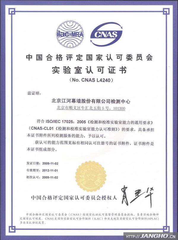 \r\n 自2009年11月3日起,江河幕墙检测中心出具的工程材料试验检测报告在认可范围内将使用CNAS认可标识和ILAC-MRA/CNAS国际互认联合标识。检测结果将在46个国家和地区得到互认,相当于企业获发了一张"国际通行证"。