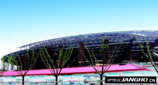 上海世博演艺中心为上海世博会最重要的永久性场馆之一,也是上海市新地标性建筑。自2009年初成功中标以来,江河幕墙针对其独特的建筑造型及紧张的施工工期,进行了科学组织、严密部署,目前,工程整体施工平稳有序推进。 \r\n 该工程合同工期为2009年2月26日至2009年9月20日,其中在5月20日必须完成上壳屋面止水,加上其独特的"飞碟"状建筑造型,给设计、施工等部门的工作带来了巨大的挑战和压力。为此,项目部与公司各个部门紧密联系、密切配合,集中优势施工力量,以充分保证工程的顺利施工,科学有序地策划了一系列工期控制节点:\r\n 2月28日,召开第一次施工策划会,制定了详细的设计、采购、生产加工以及施工进度计划,为工程开了个好头;\r\n 3月19日,工程屋面板系统抗拉试验顺利通过,得到了业主、总包及监理的一致好评,其中提供的可靠的技术支持,为工程工期提供了有力保障;\r\n 3月25日,第一榀屋面钢架成功吊装,标志着项目的施工正式开始;\r\n 3月27日,召开第二次施工策划会,会上修改并达成新的设计、采购、生产加工以及施工进度计划,以保证在5月20日完成屋面止水工作,并对下阶段施工提出了更高要求:在确保工期和质量安全的前提下,务必保证在9月20日前完成施工任务。\r\n 截至目前,工程屋面的近二百榀钢架已经成功吊装,吊装部位0.7mm穿孔钢底板已安装就位,玻璃纤维布及吸音棉铺设已基本完成,2mm镀锌钢板也已完成上壳屋面四分之三,直立锁边屋面板已完成五分之二。\r\n 为不影响工期、加快进度,项目部持续加强了对施工队的要求和管理,目前幕墙施工人员近两百人,各项工作正紧张有序开展,项目部也积极做好了对工程质量安全的监管力度,采取一系列措施确保施工安全,争创优质工程,为2010年上海世界博览会贡献江河的一份力量。