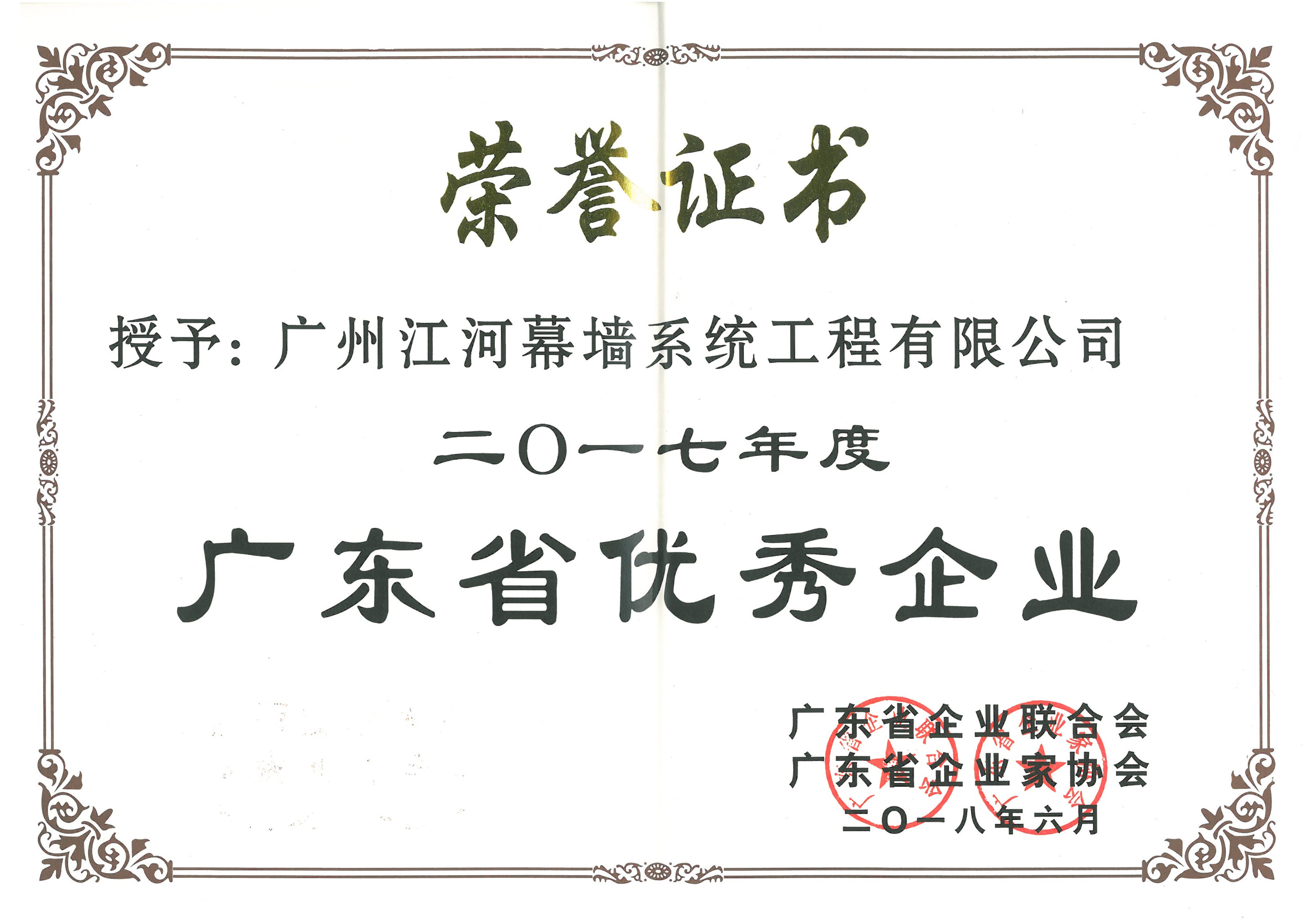 为更好地贯彻落实《中共中央国务院关于营造企业家健康成长环境弘扬优秀企业家精神更好发挥企业家作用的意见》及党中央十九大会议精神,广东省企业联合会携手广东省企业家协会,从企业的经济效益、社会效益、经营管理、科技创新、品牌地位等方面,对广东省内3500余家企业进行考察、评选,最终确定110家优秀企业和60名优秀企业家代表名单。广州江河幕墙因良好的经济效益、先进的管理体系、杰出的社会贡献再次荣登广东省年度优秀企业光荣榜,被授予"2017年度广东省优秀企业"称号、广州江河幕墙董事长戴竣被授予"2017年度广东省优秀企业家"称号。我司连续两年获此"双优"殊荣,充分展现了江河幕墙的在粤港澳大湾区的强大影响力。