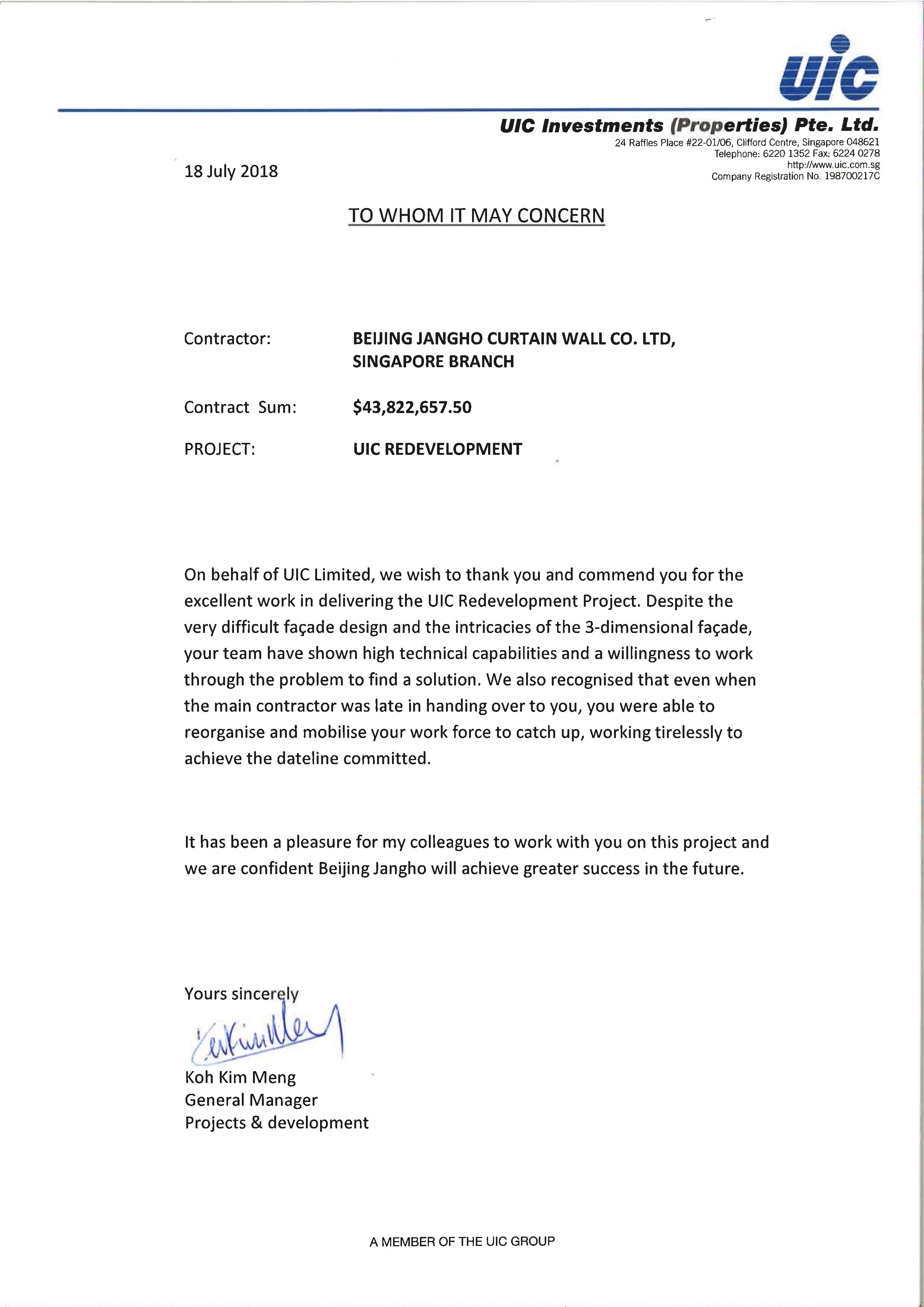 \r\n我代表UIC有限公司感谢你们在UIC项目上的出色工作。尽管此工程造型复杂,设计难度很大,但你们积极主动克服所有难题,充分展现了江河幕墙非常高的技术能力。我们特别认可和感谢你们在总包结构延误的情况下,不辞辛苦全力追赶进度,最终完成了既定工期目标。