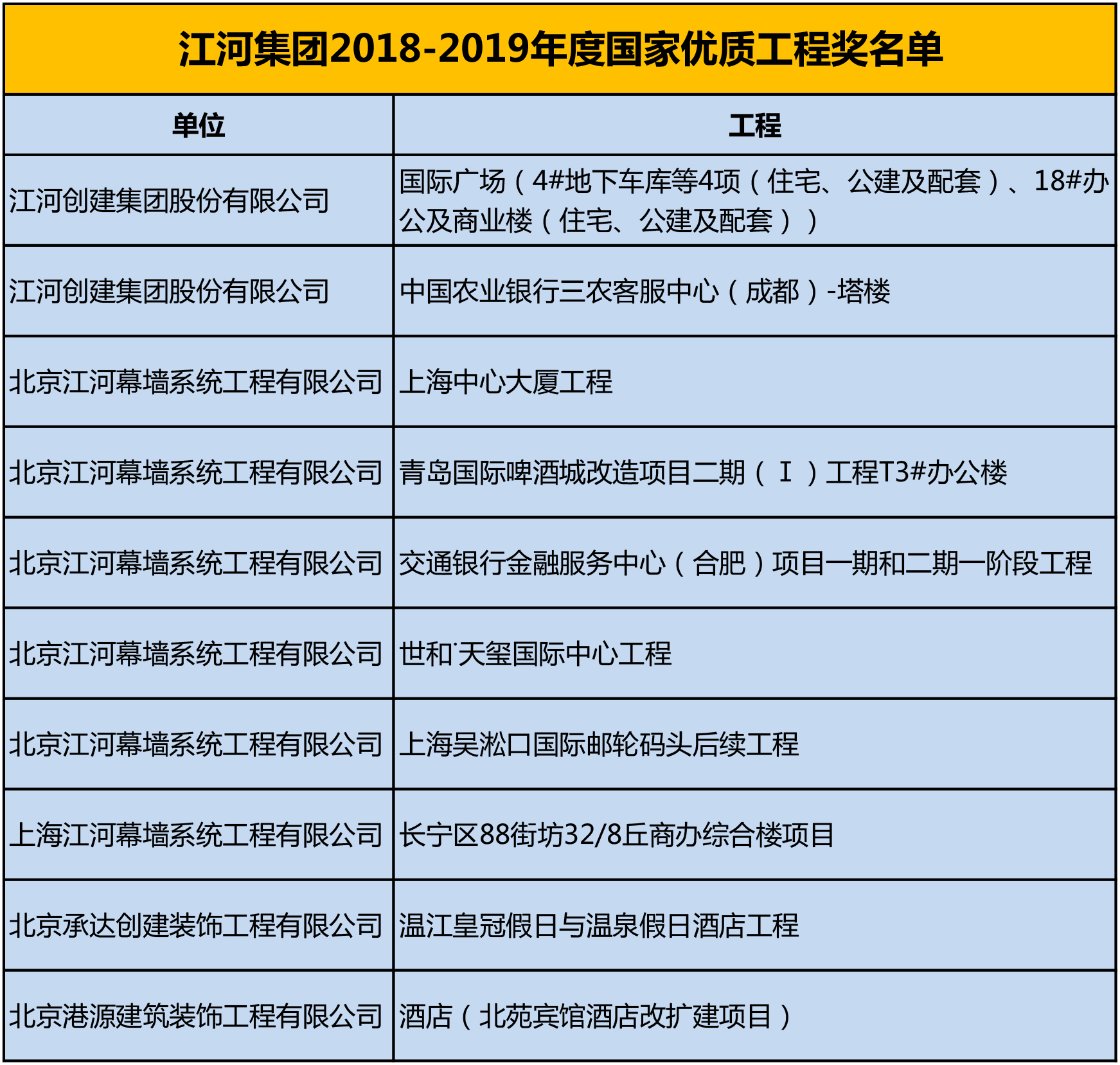 近日,2018~2019年度国家优质工程奖入选工程名单公布,江河集团及旗下子公司参建的上海中心大厦工程、上海吴淞口国际邮轮码头后续工程、温江皇冠假日与温泉假日酒店工程、北苑宾馆酒店改扩建项目等10项工程斩获殊荣。截止目前,江河集团共获得国家优质工程奖26项。\r\n