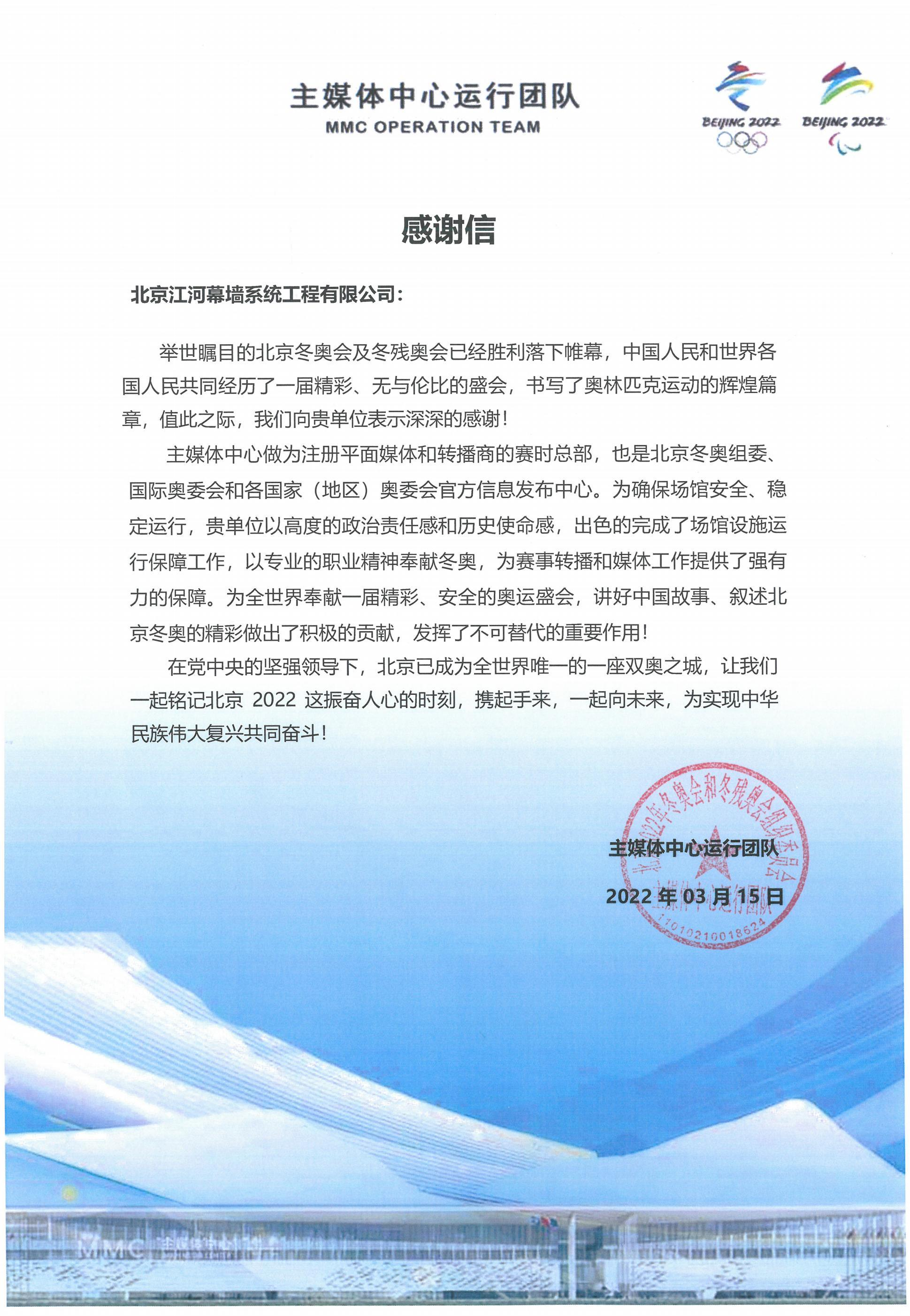 \r\n3月15日,江河幕墙收到来自北京冬奥组委主媒体中心运行团队发来的感谢信。信中高度赞扬了江河幕墙团队为确保主媒体中心安全、稳定运行,以专业的职业精神奉献冬奥,为赛事转播和媒体工作提供了强有力的保障。