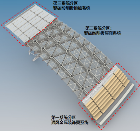新工体屋面幕墙主要分为三大系统:通风金属装饰翼系统、聚碳酸酯板屋面系统、聚碳酸酯板挑檐系统,整体幕墙具备遮阳、照明、排集水、融雪、光伏发电和吸声降噪等功能,美观大气又实用。